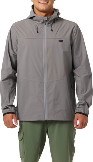 Stretchy, water-repellent nylon keeps you moving comfortably rain or shine in a lightweight windbreaker that's topped with a high-neck hood and fitted with zippered pockets for warming hands or holding small essentials.