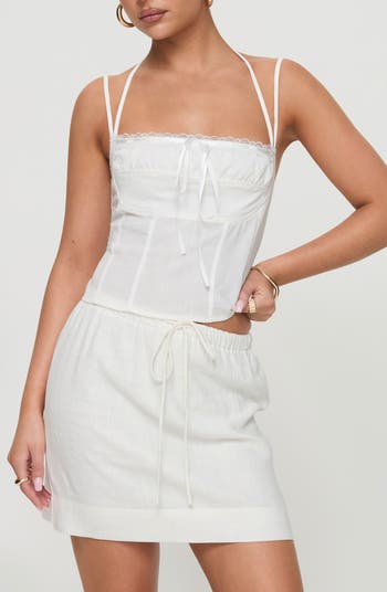 Dainty lace trim lends a delicate touch to a strappy, bustier-inspired cami enhanced with ribbon trim.