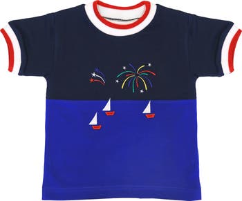 Bursting with patriotic charm, this royal and navy knit tee features lively boat appliqués and embroidered fireworks, complete with contrasting white ribbing with red tipping at the neck and sleeves.