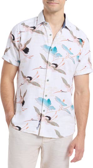Don't shut that suitcase without a short-sleeve shirt cut from linen-kissed blend and painted in captivating cranes.
