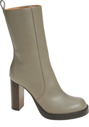 Featured on the label's fall '25 runway, this leather bootie showcases a tubular silhouette elevated on a lofty block heel and platform sole with embossed-pebbled detailing.
