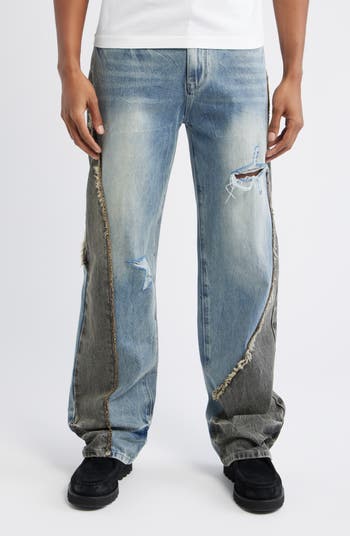 Raw edges and heavy fading bring instant history to jeans cut from panels of black and blue cotton denim in a fit that sits above the hips and stays comfortably slim down to the puddled, rumpled hems. Cross-shaped logo details hide in plain sight in the rivets on the pockets and the threadbare rip on the left thigh.