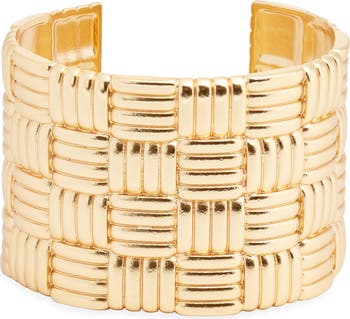 A woven texture makes a distinguished statement on this stunning cuff bracelet plated in 24-karat gold.