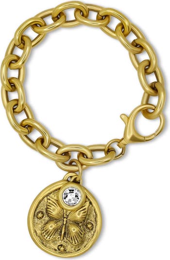 A symbol of beauty and change, the Tula Bracelet with CZ add on charm captures the beauty of change and the perfect reminder that you're always evolving. The charm bracelet features a double-sided design—with a delicate butterfly on one side and a symbolic maple leaf on the other. Whether you’re embracing transformation or staying grounded in your roots, Tula is the perfect balance of grace and strength. 12k Gold Plated Blair Chain 12k Gold Plated Double Sided Butterfly Charm CZ Add On Charm Small/Medium (7.5") | Medium/Large (8") Clasp Attaches to Any Link
