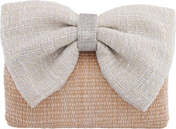 A rhinestone-embellished bow highlights the woven straw exterior of a slender clutch featuring an optional chain strap for hands-free wear.