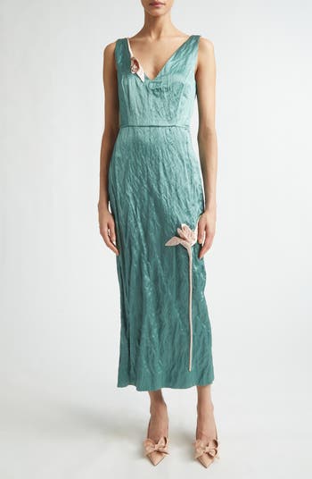 Erdem Moralıoğlu reimagines the intricate studies of German entomologist and illustrator Maria Sibylla Merian as wearable art in this princess-seamed sheath dress, where crinkled metallic satin becomes a canvas for exquisitely folded tulip appliqués inspired by the naturalist's botanical etchings.