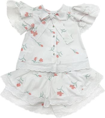 - White Blouse and Shorts with Red Tulip Print Embroidered lace trim on hem and bodice Adjustable Waist Shorts Unlined and lightwieght, breathable material Tulip flower buttons closure on blouse 60% Cotton, 37% Polyester, 3% Lycra Made In Turkey Two piece set Hand Wash in Cold Water with mild detergent. Do Not Bleach, Do Not Tumble Dry.