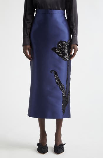 Erdem Moralıoğlu reimagines the floral still lifes of seventeenth-century Dutch masters as wearable art in this silk-kissed mikado pencil skirt, where an embroidered tulip blooms in sparkling sequins and beads against a yarn-dyed midnight canvas.
