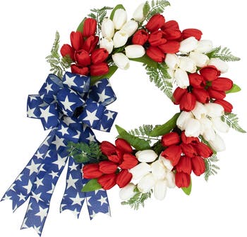 This stunning wreath is a vibrant tribute to the beauty and pride of the United States, making it the perfect piece for your 4th of July holiday or year-round American decor. This flag-inspired wreath showcases a delightful arrangement of tulip flowers in patriotic hues of red and white for Memorial Day or Independence Day. A big blue bow with white stars completes the look. Whether you're hosting a Fourth of July celebration or simply want to showcase your love for your country, this American wreath is a true symbol of patriotism. Product Features: Patriotic floral tulip wreath Adorned with red and white tulips delicately nestled amidst a medley of greenery Enhanced with a blue and white star ribbon bow Recommended for indoor use - if using outdoors place under a covered area No assembly required – wreath comes in 1 piece Natural twig grapevine backing Comes ready to hang on a plastic loop Dimensions: 24” diameter (measured from outermost tip/edge to outermost tip/edge across the wreath) Material(s): PVC/polyester/wire/twig