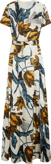 Erdem Moralıoğlu reimagines the intricate studies of German entomologist and illustrator Maria Sibylla Merian as wearable art in this belted drop-waist gown, where midweight duchesse satin becomes a canvas for a tulip print inspired by the naturalist's botanical etchings.