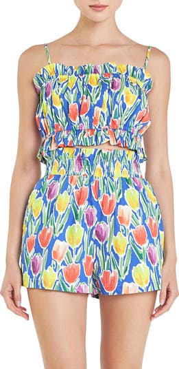 Smocking at the back shapes a ruffled cotton crop top printed with a field of colorful tulips.