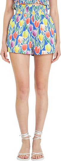 A ruffled high waist tops cute cotton shorts printed with a field of colorful tulips.