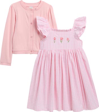 Your little lady will look sweet and sophisticated wherever the day takes her in this two-piece ensemble featuring a pleated dress with tulip sleeves and a coordinating button-front cardigan.