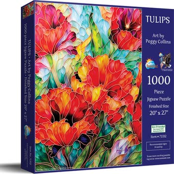 Experience the enchanting beauty of spring from your own home with the Tulips 1000 Piece Jigsaw Puzzle by Peggy Collins, presented by SunsOut Puzzles. Each interlocking piece intertwines vibrant flowers with craftmanship to transport you into a tranquil world. Constructed in the USA, the puzzle embodies the sublime artistry of tulips through its intricate details and vivid colors. Uniquely showcasing resilience and eco-friendliness, it is made from high-quality recycled cardboard and painted with environmentally friendly soy-based inks, making it a rewarding and relaxing pastime for everyone. Boasting a finished size of an impressive 20" x 27", the puzzle's seamless assembly offers constant enjoyment. Adding to its allure is SunsOut Puzzles assurance of integrity with a promise to swiftly resolve any issues related to missing or damaged pieces, reassuring your peace of mind. This 1000 piece jigsaw puzzle, perfect for adults, not only satisfies the avid puzzler but even invites newcomers into the captivating realm of radiant flowers. Offering a serene escape, it captures the beauty of nature making it a thoughtful gift for a loved one or a delightful treat for oneself. Immerse yourself in the captivating world of tulips with each piece assembled and capture the joy that each bloom ensues - order your Tulips 1000 Piece Jigsaw Puzzle today.