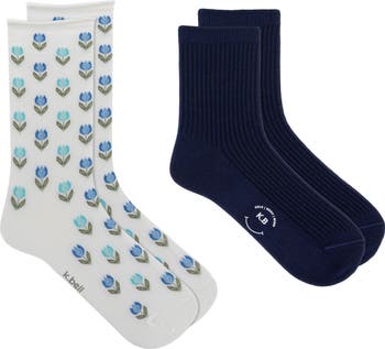 Rolled edges bring a comfortable fit to these lightweight crew socks patterned in sweet jacquard tulips.