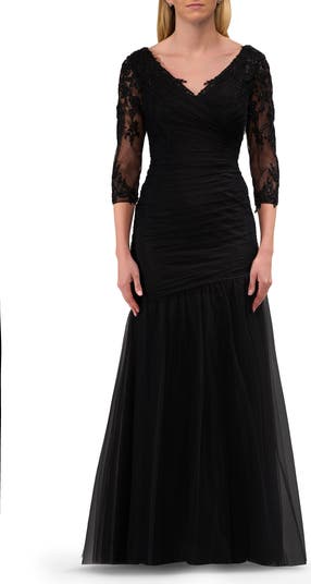 Ruched tulle gown with a flare skirt and V neckline. The illusion three quarter sleeves feature beaed lace applique. Back zipper closure.