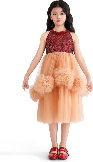 A delightful blend of sparkle and softness, this sleeveless party dress features a sequined bodice and a dreamy tulle skirt adorned with oversized pom-poms. Designed to enchant at birthdays, weddings, or holiday gatherings.