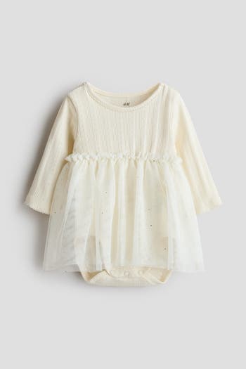 Bodysuit dress in soft cotton pointelle jersey with a glittery tulle skirt. Round, picot-trimmed neckline, a press-stud on each shoulder and long sleeves with picot-trimmed cuffs. Small frill trim at the waist and press-studs at the bottom for easy changing. Gathered seams around the legs for a more comfortable and snug fit around the nappy.
