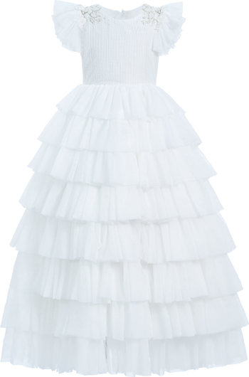 The Abbyfield dress is a charming blend of elegance and whimsy. Designed in a soft cream-white hue, this dress exudes timeless sophistication, perfect for making a statement at any special occasion. The standout feature of this enchanting piece is its delicate layers of tulle, which create a dreamy, voluminous silhouette. The flowing design adds an air of magic and grace, making it ideal for twirling moments or capturing unforgettable memories.