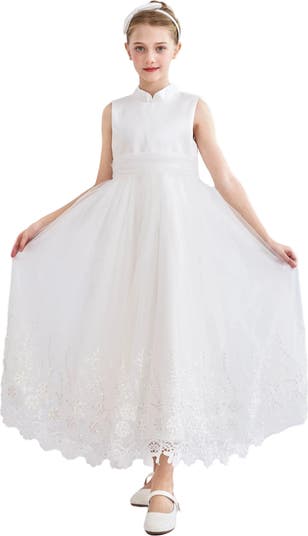 A graceful full‑length gown with a fitted bodice, high neckline, and sheer overlay skirt finished with intricate floral embroidery for timeless elegance. Refined Silhouette: Waistband highlights the shape, while lace detailing at the hem adds sophistication. Occasion Perfect: Designed for weddings, communions, and formal celebrations.