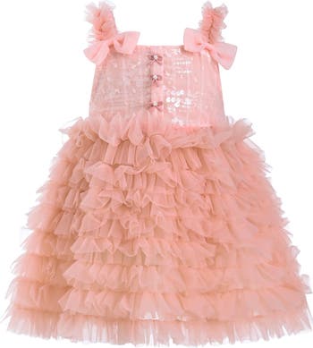 The Bow Tiered Tulle Dress exudes delicate elegance with its cascading tulle layers and charming bow detail. The crisp color hue adds a timeless touch, while the tiered silhouette creates graceful volume and movement.