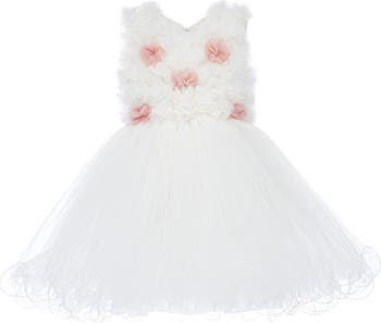 The Cambriana dress features a sleeveless bodice with floral appliques in complementary hues. Lightweight tulle skirt, making this piece the perfect flower girl dress!