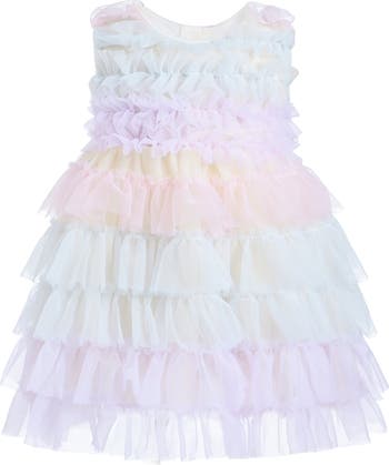 The Ruffle Layered Tulle Dress is pure enchantment with its soft hue and cascading ruffle layers that add volume and movement. The airy tulle fabric gives it a light, whimsical feel, perfect for twirls and playful elegance.