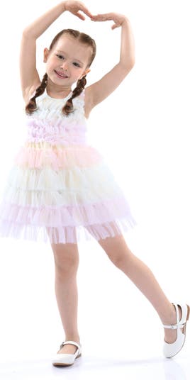 The Ruffle Layered Tulle Dress is pure enchantment with its soft hue and cascading ruffle layers that add volume and movement. The airy tulle fabric gives it a light, whimsical feel, perfect for twirls and playful elegance.