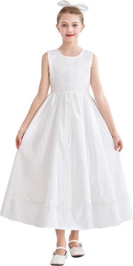 - 100% PolyesterSleeveless formal gown with fitted bodiceSubtle embellishments across bodice detailFull ankle‑length skirt with decorative trim at hemLarge bow headpiece accent for ceremonial stylingElegant design for weddings, communions, and special occasionsImported