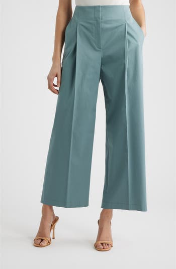 Clean minimalism shines through the tailored pleats and integrated waistline of these stretchy cotton-twill pants cut in a straight-leg silhouette.