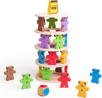 Who will be the first to knock the honey pot down? Kids can take it in turns to build their teddies up on each wooden ring with our fun Tumbling Teddies set. This playful wooden teddy bear game is great for interactive group play and encouraging children to use their strategy skills.