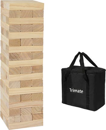 WOODEN TOPPLING TOWER - GIANT - 28" - Tumble Tower is a stacking game of physical and mental skill that challenge players to carefully remove one block at a time from the tower and place it on top without causing it to collapse, creating a teetering structure that grows taller and more unstable with each turn This classic game is fun to build tense and exciting moments with family and friends, which makes it perfect for family game nights or parties. Trimate tumble tower is made from premium natural pine wood, which promises the blocks to be durable and cause no damage to your skin. A durable oxford bag with 2 strips is included, allow you to carry and store the blocks easily. CUSTOMIZE THE GAME: Make the game your own with the included 27 blank blocks and 27 numbered blocks (1-9). You can design your own set of rules, adding a personalized touch to each game and ensuring everyone can enjoy their own unique version of this classic stacking challenge. Crafted from high-quality, NATURAL PINE WOOD, these unpainted blocks are safe for handling and built to last. The durable construction can endure repeated plays and tumbles without cracking, making it a long-lasting addition to your collection of outdoor games. STORAGE CARRY BAG: For convenience, the set comes with a portable 600D oxford zippered bag, equipped with two durable straps for easy transport to the yard, beach, or parties, and for convenient storage when not in use.