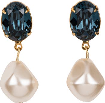 Oval-cut Czech crystals provide a sparkling counterpoint to lustrous baroque faux pearls on these glamorous drop earrings plated in warm 18-karat gold.