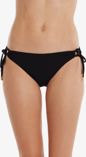 Our tunnel side hipster features flirty adjustable side ties, with lovely gold end-beads that complement the richness of the look. Super-flattering, very sexy.