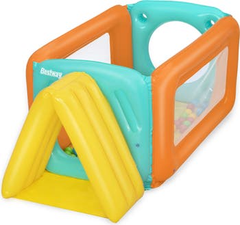 The Bestway Tunneltopia Ball Pit is the coolest place for kids to play. With its triangular tunnel entrance, kids will have a blast crawling back and forth into the ball pit, or they can use the door in the back. The Tunneltopia Ball Pit stimulates the development of fine motor skills, gross motor skills and hand-eye coordination while they have fun. As they scooch themselves along, pick up the 25 included play balls and sort them using the ball game on the back wall, they are working on tangible skills that will help them navigate the world as they grow up! The ball pit is surrounded with mesh walls, so that parents are always able to keep their eyes on the kids as they play. This ball pit is easy to inflate and get playing! Once finished, it’s easy to deflate this toy and fold it down to a compact size for convenient storage. With the Bestway Tunneltopia Ball Pit, kids will have a blast in the best hang out in town! Benefits of Developmental Play: Ball pits are great toys for working towards developmental milestones, because they include many different types of activities. Games including play balls help children develop their fine motor skills by working on hand-eye coordination and basic levels of dexterity. Likewise, any chance to play with other children is a great opportunity to work on their confidence and communication by encouraging your child’s self-esteem through interactive play. Bestway designs each ball pit, bouncer and play center with developmental milestones in mind.