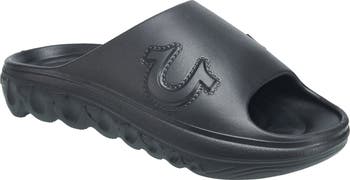 Elevate your off-duty style with the True Religion Men's Tupac Band Slide. The wide band showcases an embossed True Religion horseshoe logo for a bold yet clean aesthetic. Made with a contoured footbed and lightweight material, it's perfect for everyday wear—whether you're chilling at home, hitting the pool, or stepping out in laid-back style. Effortless, iconic, and built for comfort.