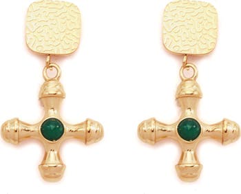 Show your faith with textural cushion-shaped earrings suspending mini cross drops centered by bezel-set green stones.