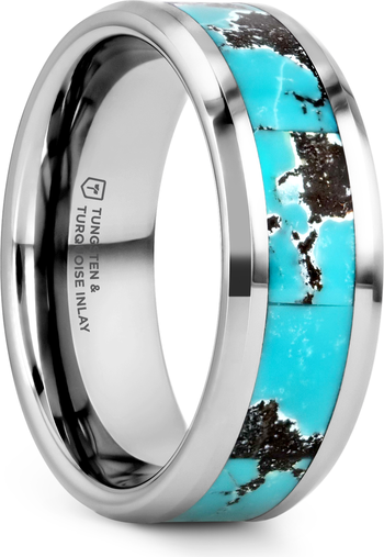 Turkis men's tungsten wedding band by Thorsten Rings is the perfect choice for those looking for a unique and stylish ring. This durable tungsten wedding band includes a beautiful Natural Turquoise inlay with a distinctive spiderweb pattern that's unique to each ring!