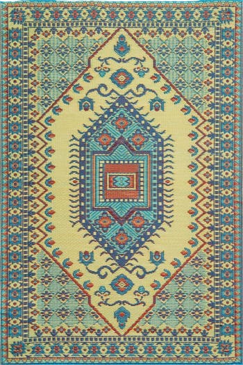 - - 100% recycled polypropylene - UV / fade resistant - water repellent / mold resistant - stain resistant - indoor & outdoor use - debris and sand brushes right off - was with a hose or mop and light detergent