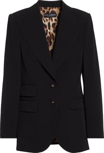 Tonal pickstitching highlights the contoured hourglass shape of this fitted virgin-wool blazer with oversized peaked lapels. Logo-embossed buttons and a leopard-print lining put the Italian fashion house's unmistakable stamp on this signature style.