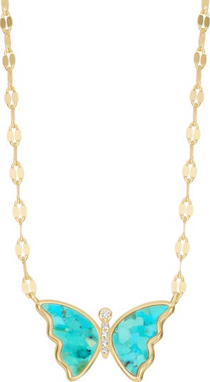 A beautiful turquoise butterfly pendant alight with pavé cubic zircona swings from this flat-disc necklace plated in polished 14-karat gold.