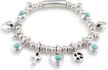 - A variety of symbolic charms hang from rounded beads to form this eclectic boho piece