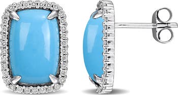 Make a bold yet sophisticated statement with these stunning turquoise and diamond halo earrings. Set in luminous 14K white gold, each earring features a captivating 2 cushion-shaped turquoise center stone, prized for its vivid robin's egg blue hue and smooth, polished surface. Surrounding the turquoise is a sparkling halo of 68 round brilliant diamonds, expertly crafted to enhance the gemstone’s vibrant beauty while adding a touch of radiant luxury.