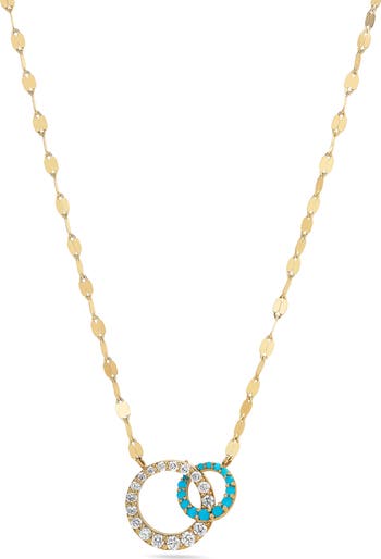 Color and sparkle mix in this 14-karat gold pendant necklace anchored with interlocking turquoise and diamond discs.