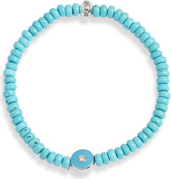 Smooth turquoise rondelles line this handcrafted stretch bracelet with a sparkling eye charm at the center for added mystique.