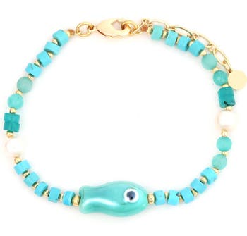 Accessorize your look with the aquatic whimsy of this beaded bracelet embellished with freshwater pearls and vibrant turquoise stones.