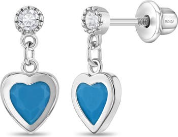 Sweet and sparkly, these dangle heart earrings are a lovely way to show a little love! Made from 925 sterling silver, each earring features a delicate dangling heart accented with a shimmering simulated turquoise cubic zirconia that catches the light beautifully. Designed with comfort and safety in mind, they are hypoallergenic for children with sensitive ears. They feature secure screw back closures to keep them snug and in place all day. A small gift box is included with purchase.