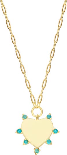 Turquoise cabochons frame a heart pendant like drops of dew on this sterling silver paper-clip chain necklace plated in polished 14-karat gold.