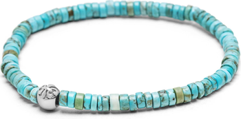 Designed and strung by hand in Los Angeles with 4mm turquoise heishi beads and a stainless steel logo accent. The elastic strand allows for easy wear and maintains its shape. Each piece is handmade and unique, with slight variations in size, shape, and color.