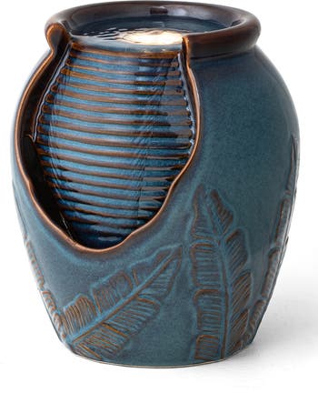 This chic and interesting ceramic tabletop fountain featured with delicate embossed leaves texture, as well as the elegant and charming kiln-fired turquoise glaze finish with antique details that brings a touch of artistic and natural beauty to your space. It has a warm white LED light, the trickling water ripples and sparkles in the warm glow, adding visual interest that is sure to convert your space into a tranquil, charming and pleasing environment. This versatile fountain will be a warm and delightful addition to any of your garden, porch or home space.